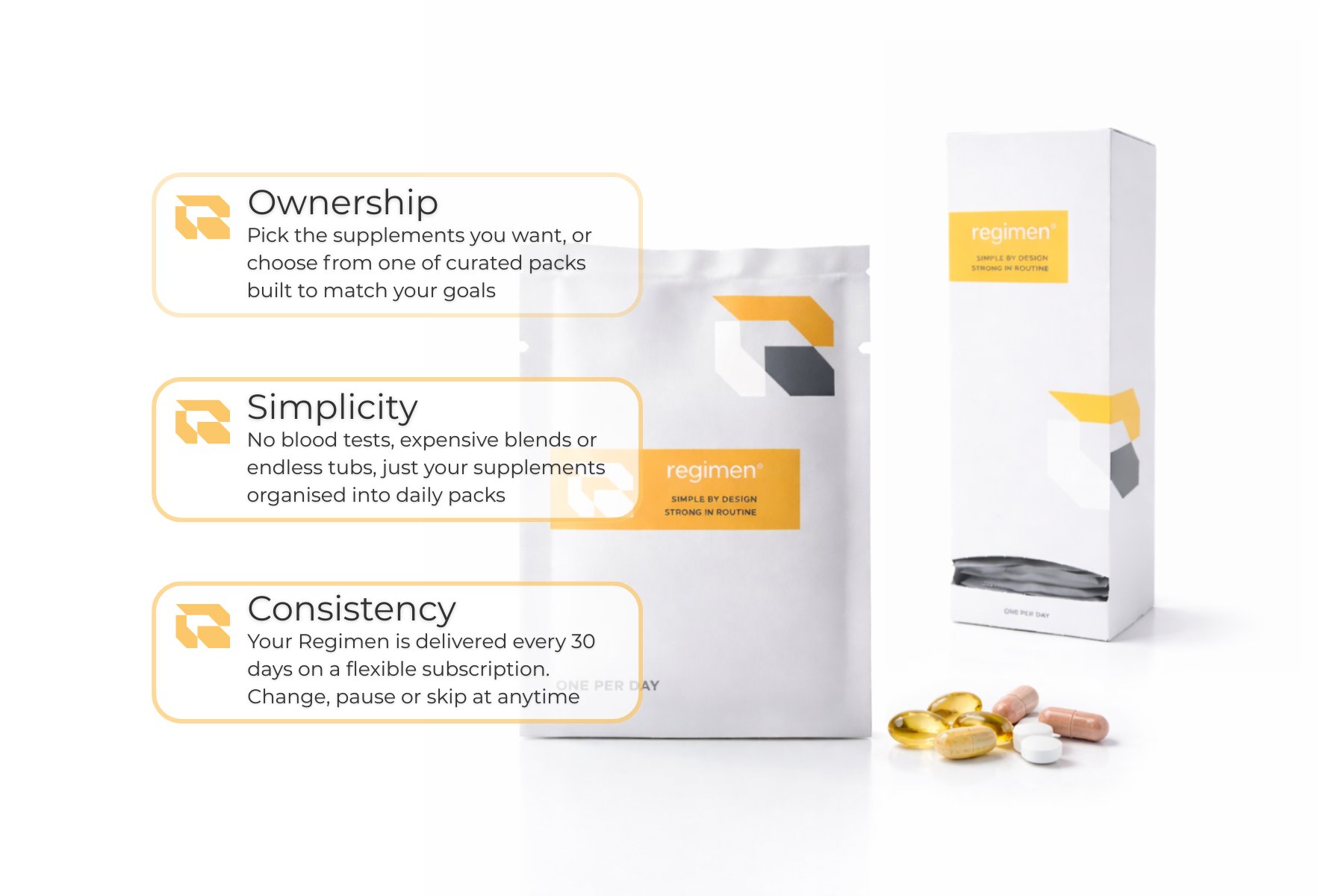 Regimen simplifies supplement routines by delivering personalised daily supplement packs every 30 days. Instead of managing multiple bottles and remembering what to take, your supplements arrive organised into convenient daily packs ready to use.